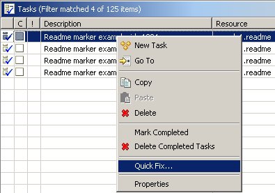 Plug-ins can also define marker resolutions, so that their markers can participate in the workbench Quick Fix... feature. Users can select a marker and choose Quick Fix... from the popup menu if there is a resolution contributed for the marker.