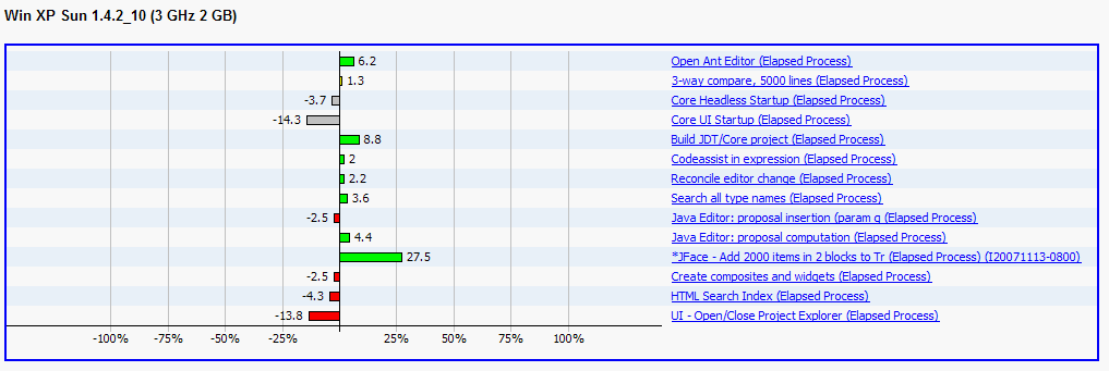 Each test have two bars: the former is white and shows the baseline result, the latter is colored (red, green or gray) and shows the current build result.