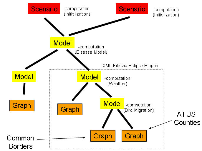 This approach is extremely flexible and powerful. The components can be from many different sources and can be exchanged among users. The components can also be combined to create larger structures which then can become reusable components themselves. For instance, it is possible to create a detailed model of a country and then reuse that model as a component in many different Simulations. Similarly, computational aspects of a Simulation such as a specialized disease model can be developed by an individual researcher and then used by many others in their models. The ability of STEM to combine components from different sources makes it possible to leverage the varied expertise of different model builders in a way that has never before been possible.
