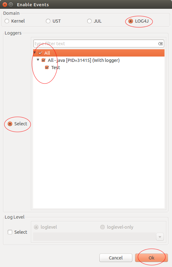 For UST it is possible to enable Tracepoint events using log levels. To enable Tracepoint events using log levels, select first the corresponding Select button, select a log level from the drop down menu, fill in the relevant information (see below) and press Ok.